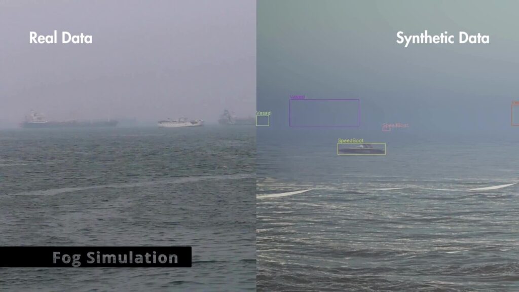 The synthetic dataset was created using the DMI Labs automation development platform. Data Machine Intelligence has leveraged its proprietary simulation engine, connected to Unreal Engine for rendering, to produce highly accurate datasets. By reproducing an environment similar to that captured in the Singapore Maritime Dataset, the simulation utilized a ray tracing engine adapted to emulate realistic camera characteristics. This process resulted in an annotated dataset with 20,000 instances, comprising 2,893 images of synthetic data and 4,062 images of real data.